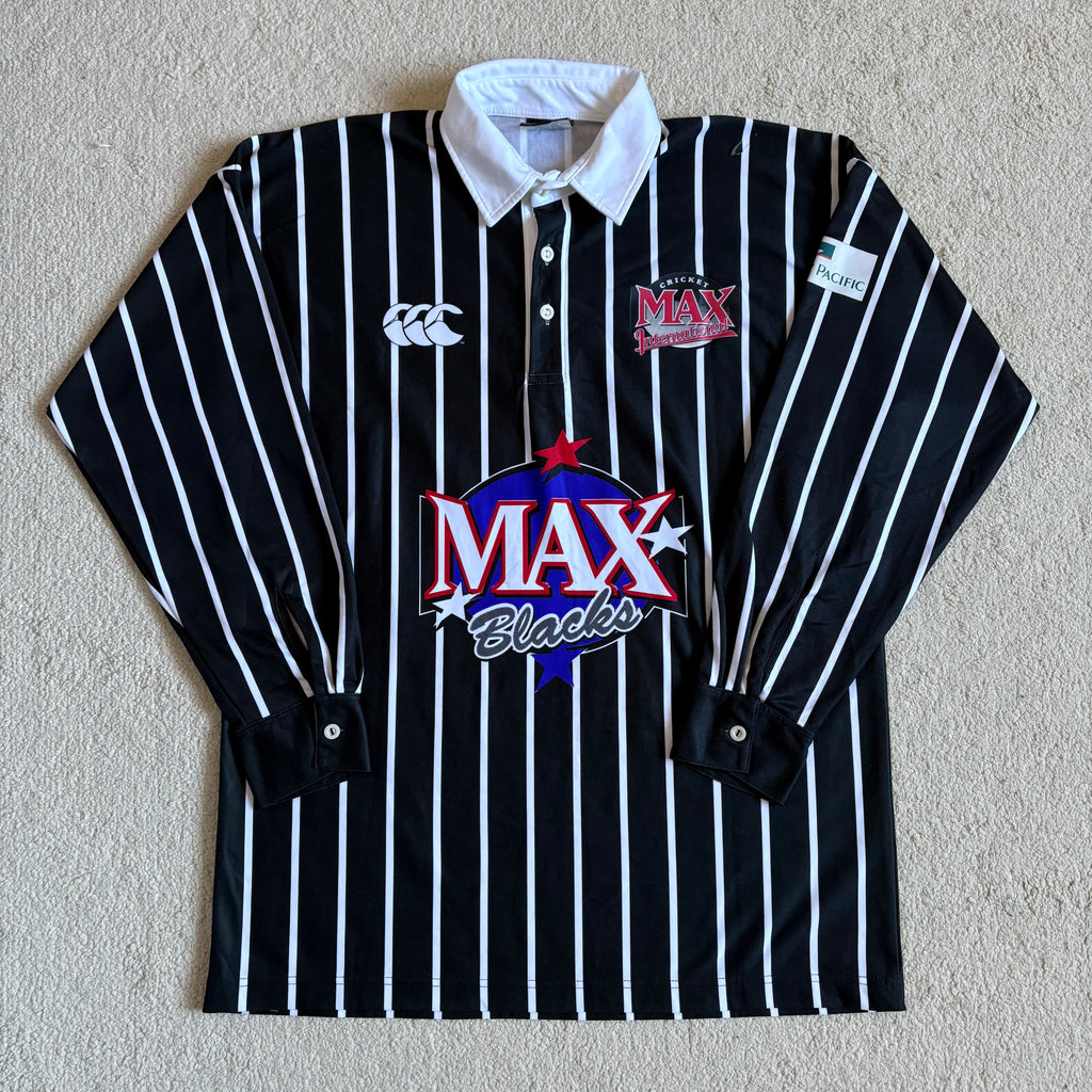 The Max Blacks played a high-profile series against the West Indies in 2000, with top New Zealand players like Nathan Astle, Chris Cairns, and Scott Styris taking part. The kit features a bold black design with unique Cricket Max branding—distinct from traditional Black Caps gear.
