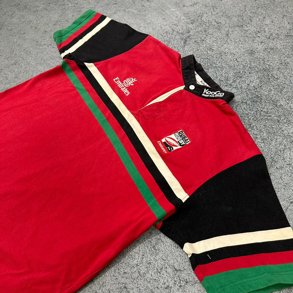 This jersey is from the Dubai Sevens, produced by Kooga, a rugby apparel brand known for supplying kit across international sevens tournaments. The Dubai Sevens is a core event on the World Rugby Sevens Series and one of the most prominent tournaments in the global sevens calendar.