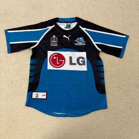 Description: Great piece of Sharkies kit, screams Brett Kimmorley and a young Gallen! An unfortunate loss in the first week of the finals against the Roosters, but no doubt this team will have continued success with a young suite of talent.