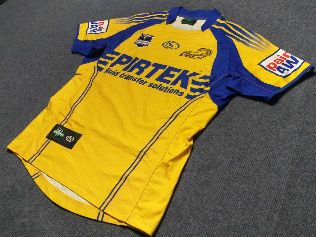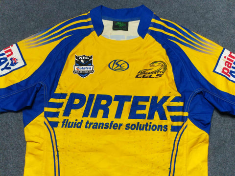 Description: One of the first Eels jerseys I can remember. I love the horizontal stubbed lines framing the Pirtek sponsor.