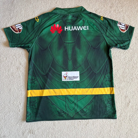 This jersey was worn by the Canberra Raiders during the 2017 “Marvel Heroes” round, where the club took the theme of the character Iron Fist. It features the Raiders’ green base with custom Marvel styling—celebrating the fusion of pop culture and rugby league.