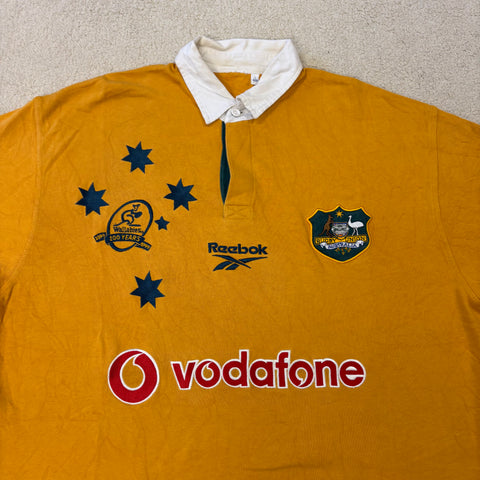 Description: An excellent Reebok Wallabies jersey. Nice thick vintage cotton, a real classic for Aussie fans! Embroidered vodafone sponsor and the special 1999 100Yrs patch. what a banger!