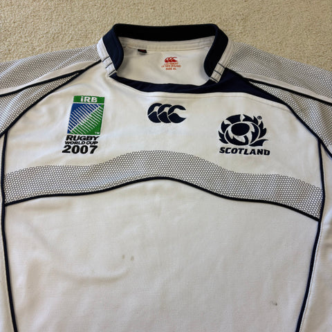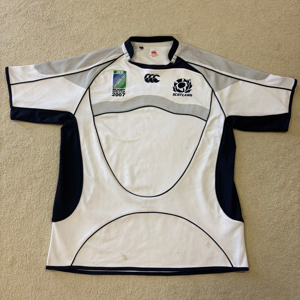 The 2007 Rugby World Cup saw Scotland reach the quarter-finals, pushed on by key players like Chris Paterson, Jason White, and Mike Blair. Wearing navy with the traditional white trim, this Canterbury-made jersey carried the modern fit of the mid-2000s while keeping the classic Scottish look.