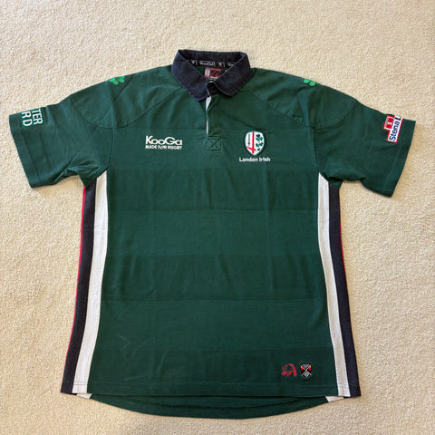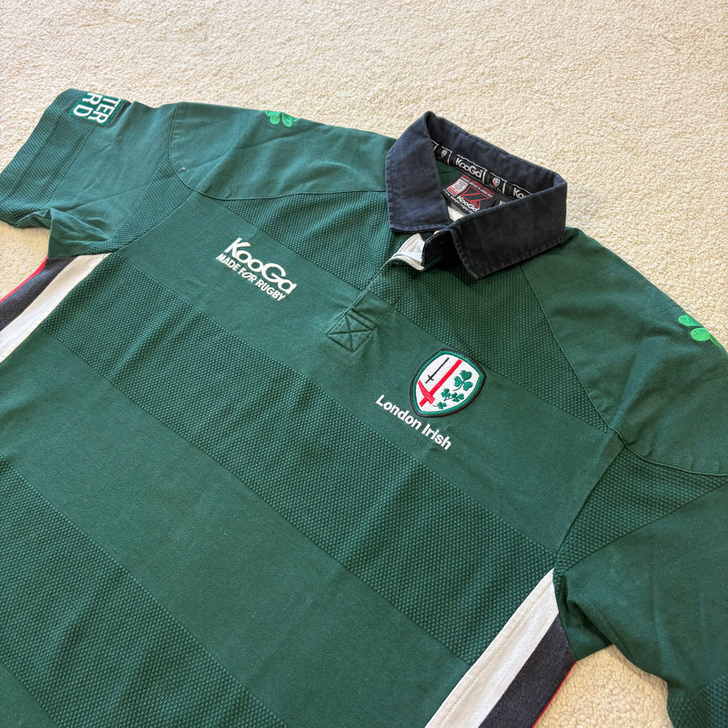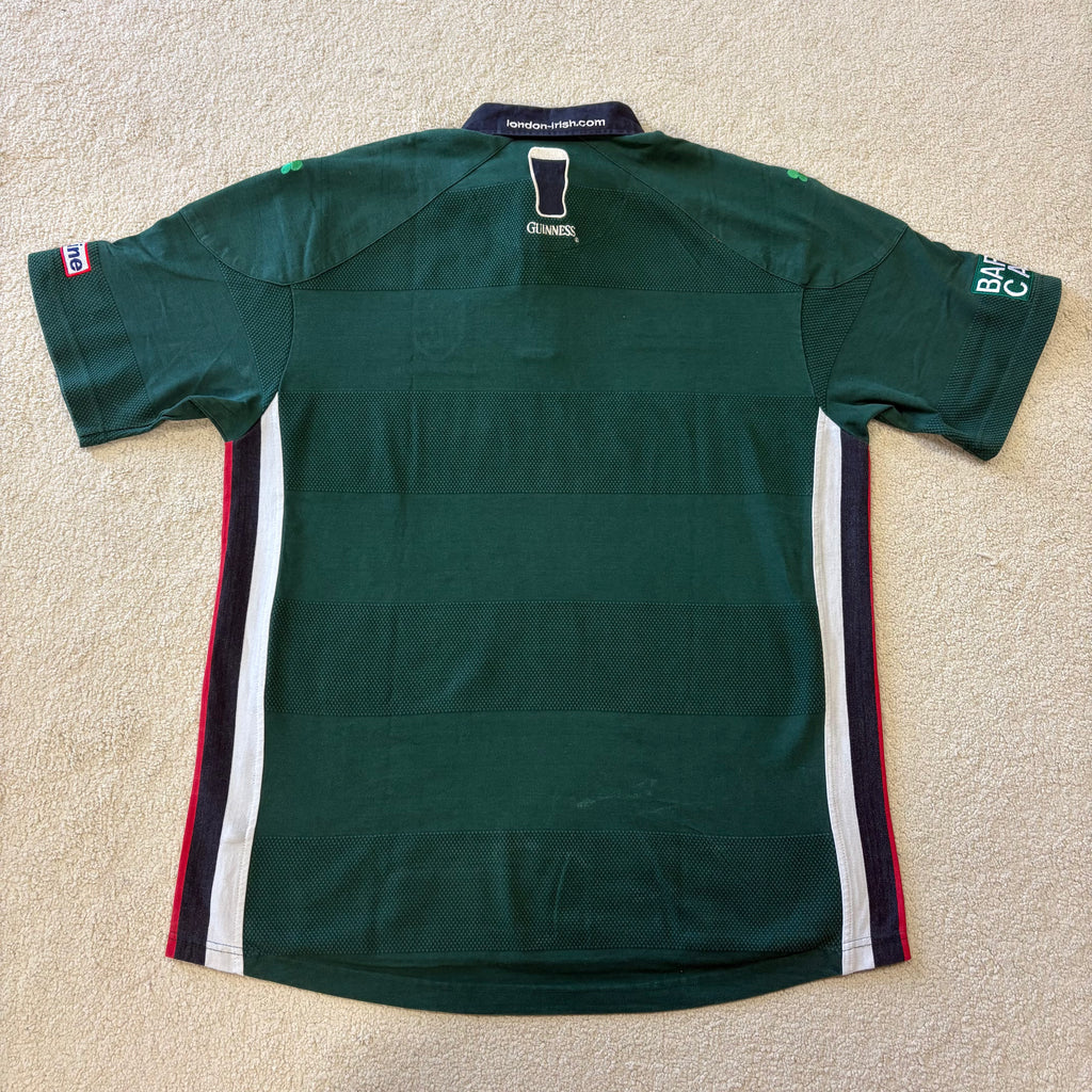 Description: Great-looking London Irish jersey. In excellent condition, with great details such as the embroidery on sleeve and front, and of course the Guinness pint patch on the back!