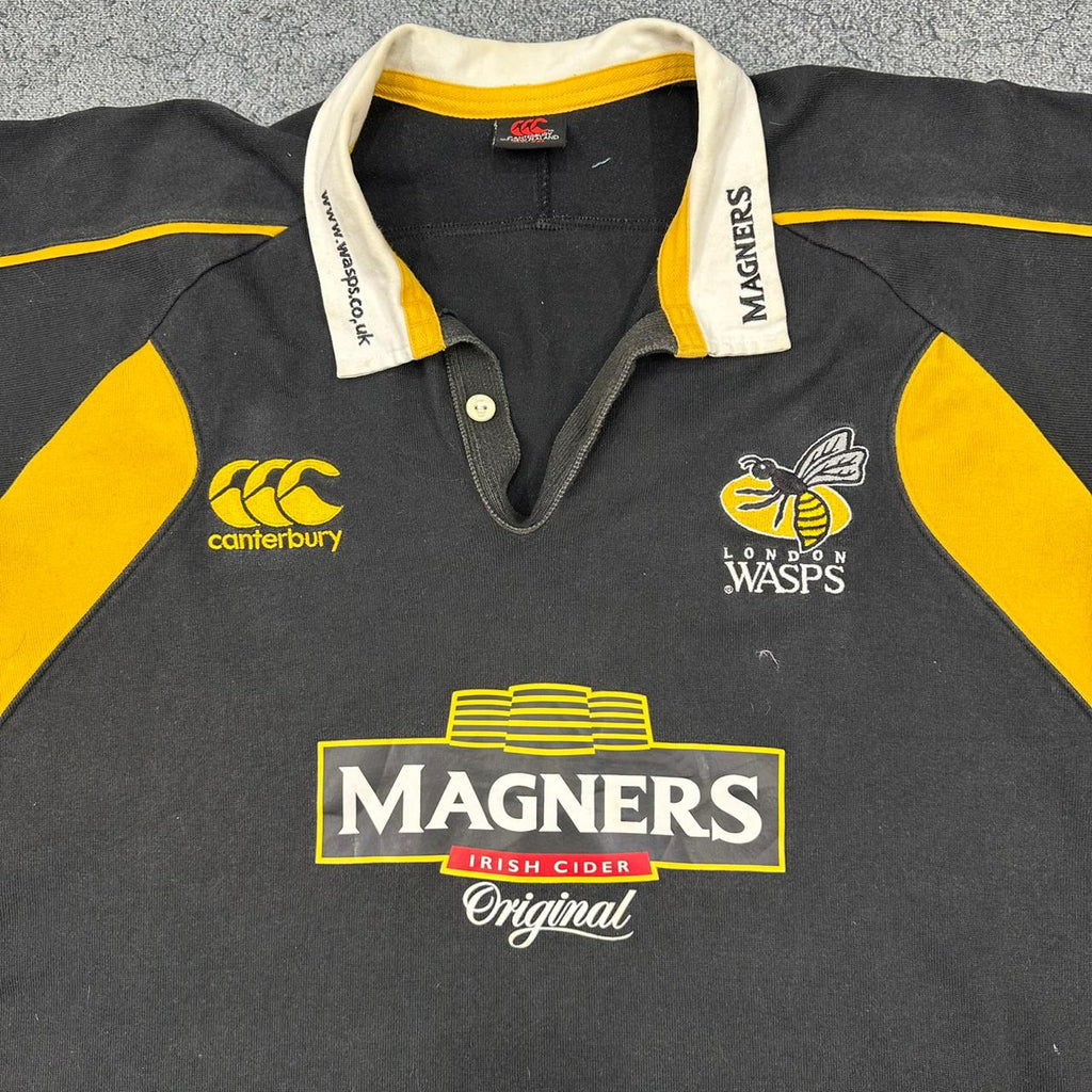 Description: The jersey itself reflects the classic Wasps identity: black with bold gold accents, the traditional wasp crest over the heart.