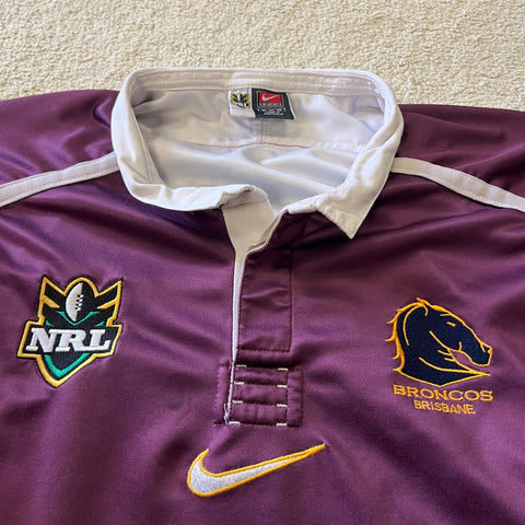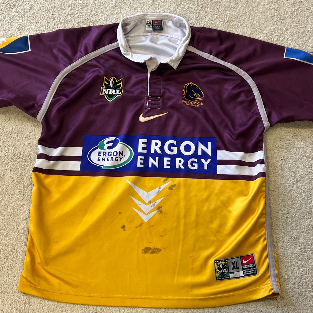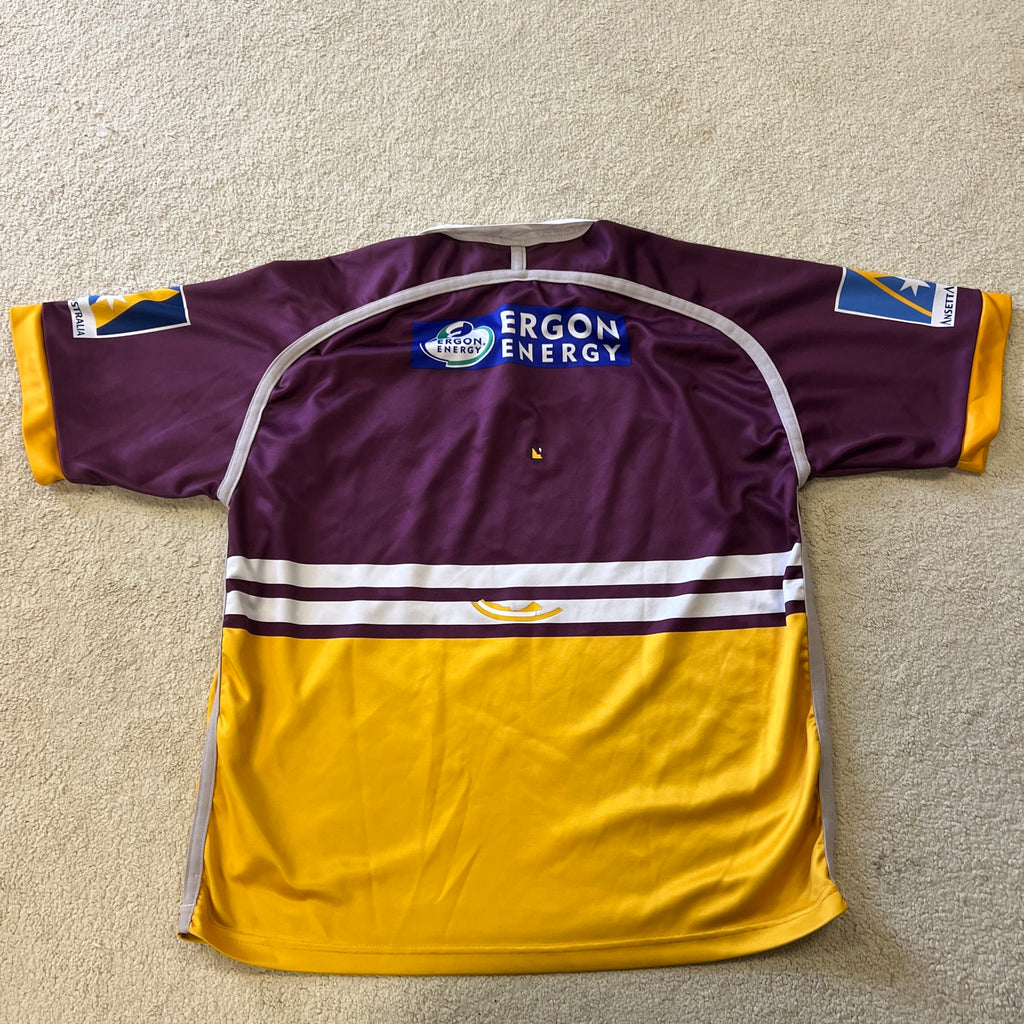 Ergon Energy across the chest, maroon and gold split design. The Broncos at the turn of the millennium, Darren Lockyer emerging as the best fullback in the game.