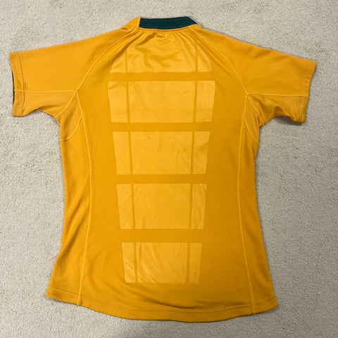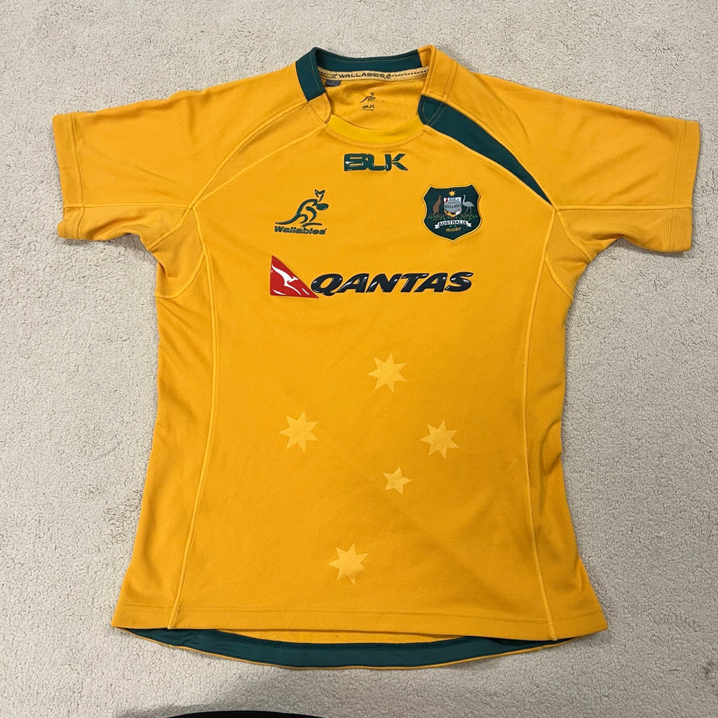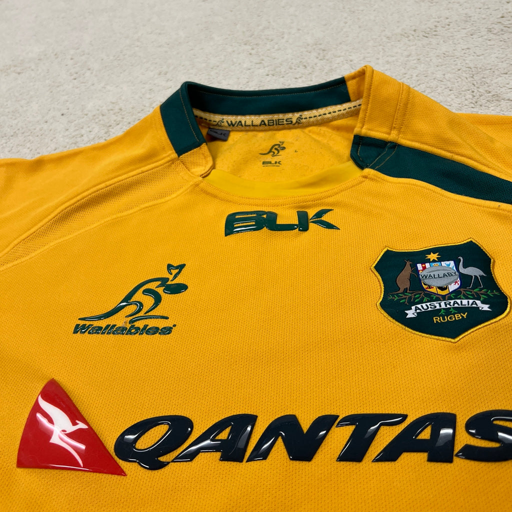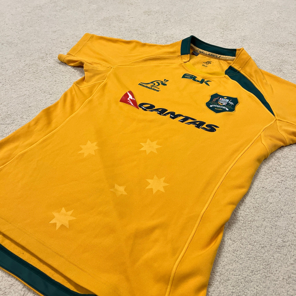 Gold and green glory! This is the BLK era Wallabies jersey from around 2013-2014, when Ewen McKenzie was at the helm and Qantas was still proudly across the chest. The Southern Cross watermark design across the front is a nice touch on these. BLK only had the Wallabies contract for a short window, so these are getting harder to track down.