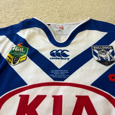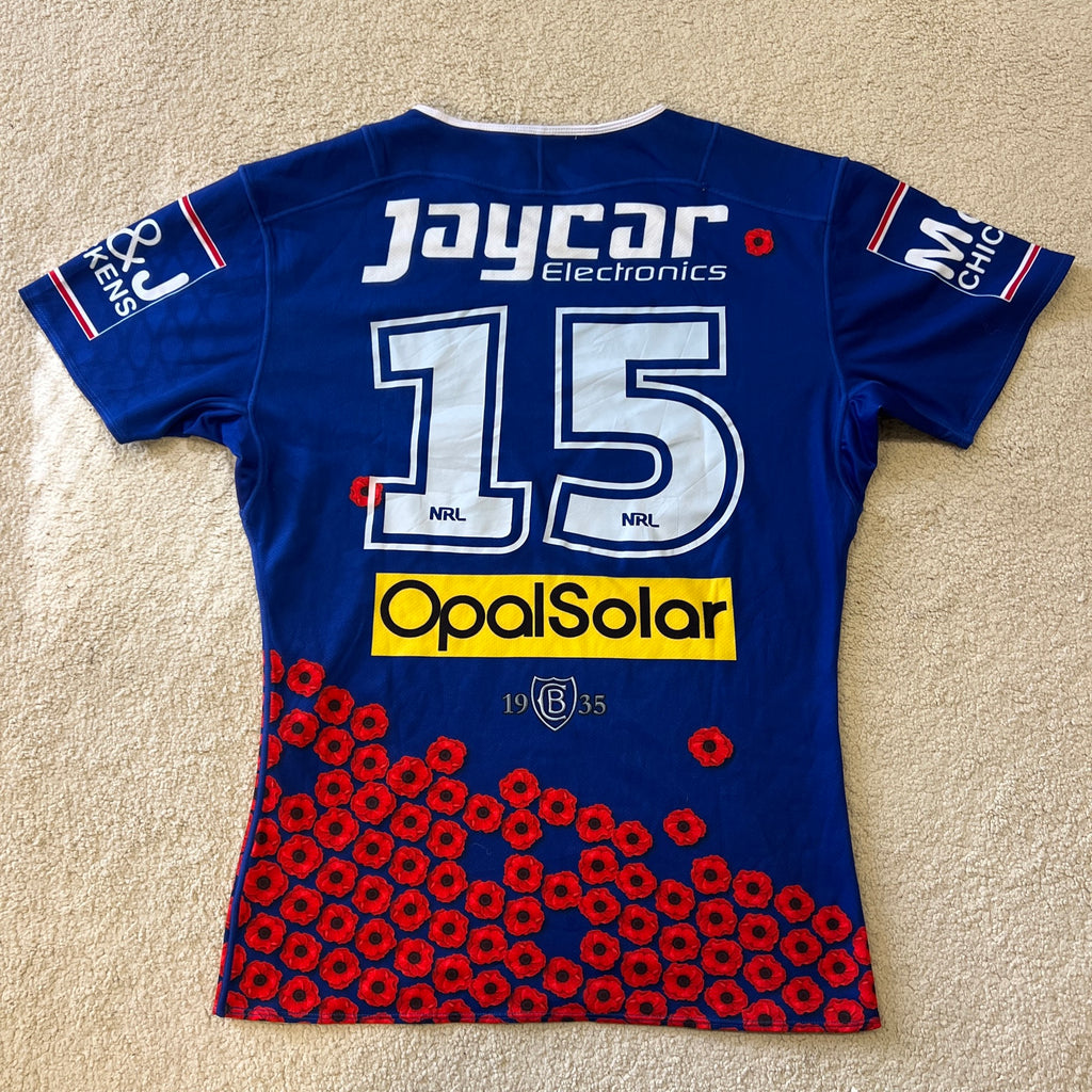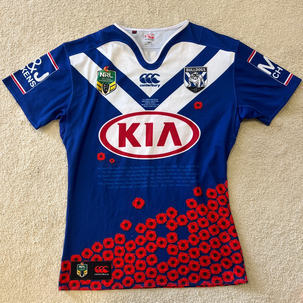 Blue and white with red poppies fading up from the hem. KIA on the chest. The ANZAC round jersey from 2016, Josh Reynolds and James Graham at the heart of the squad. #15 on the back.