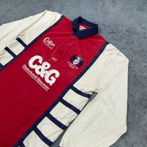 Description: Gloucester fans, this must be one of the best jerseys in club history! Thick cotton and embroidered sponsors. Coming up on 20 years old, it's a classic.
