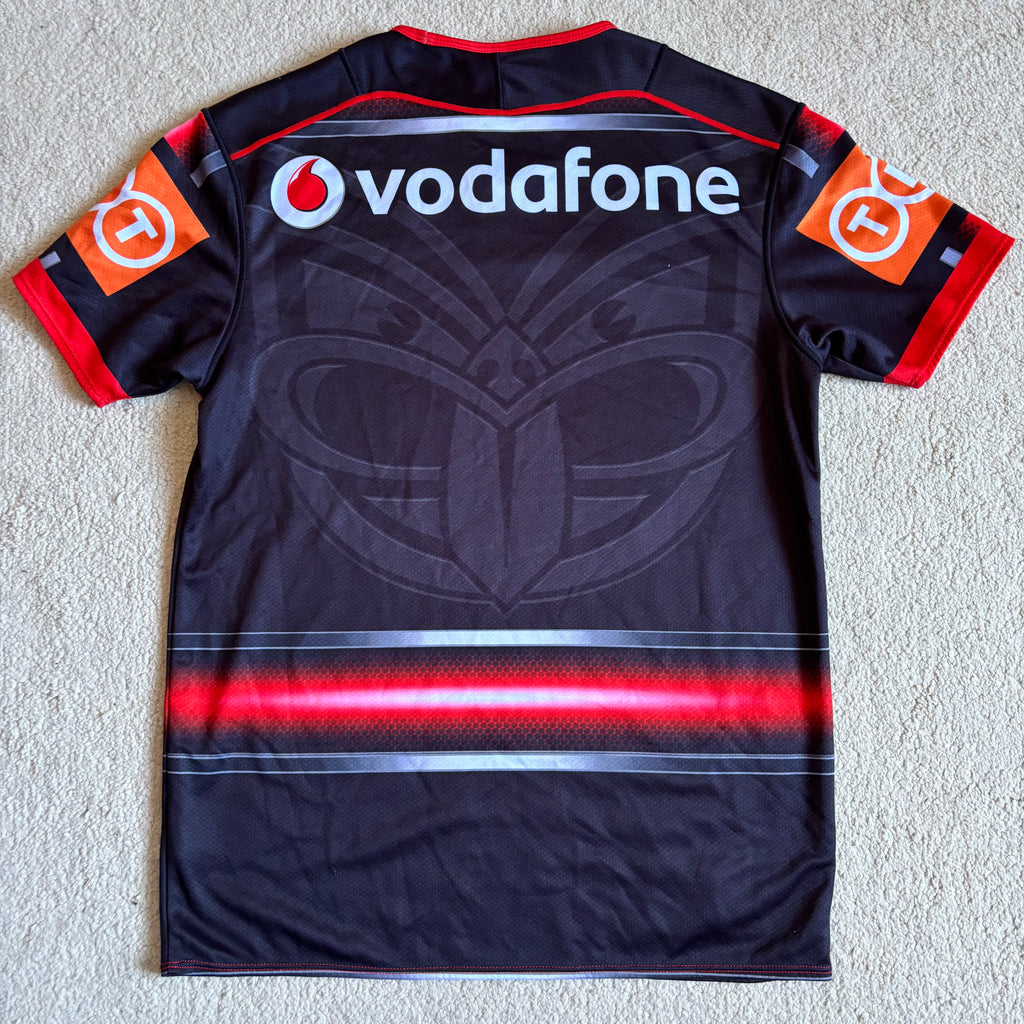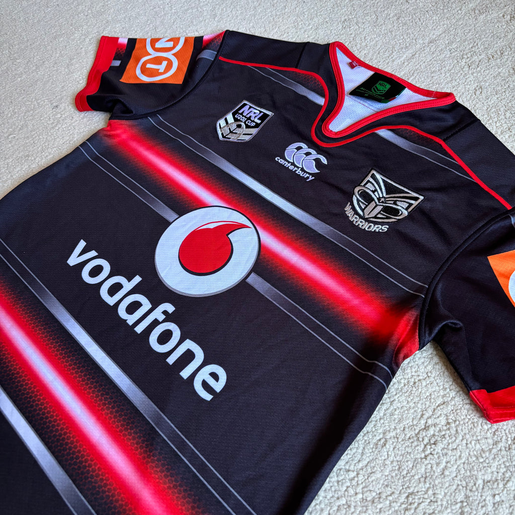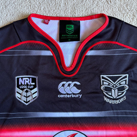 Description:  This jersey was worn by the Warriors Under-20s squad during the 2015 season. It was made by Canterbury and features a clean black and red design with silver detailing.